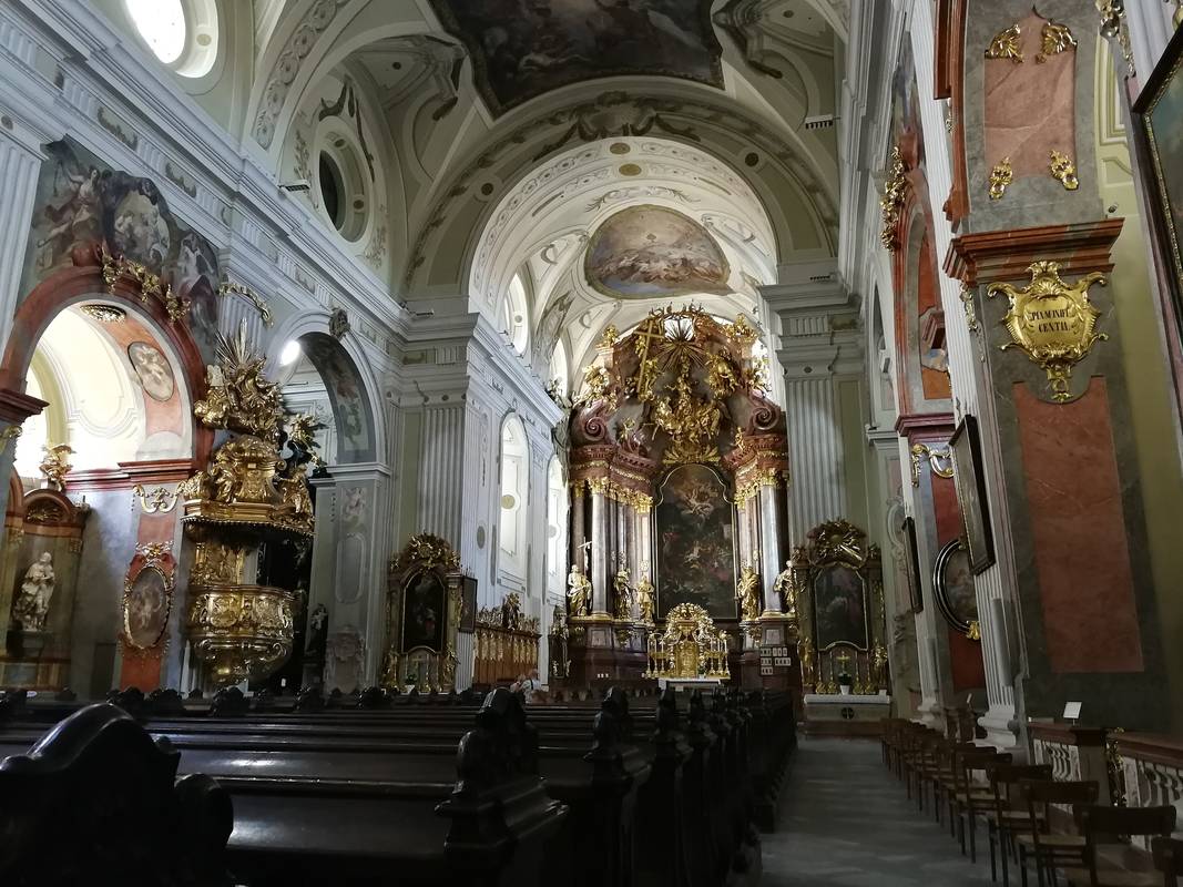 From the outside, the church appears to be an austere, early Baroque building, but the interior dates back to the 18th century. The work of the Passau sculptor and architect Joseph Matthias Götz (high altar, choir stalls, pulpit) from 1733 and the decoration of the church with ceiling frescoes were significant. They are by Martin Johann Schmidt ("Kremser Schmidt") and were created in 1787, while the high altarpiece (1734) is by Johann Georg Schmidt ("Wiener Schmidt"), an older contemporary, although there is no relationship between them. The black marble side altar in the left transept deserves special mention. It was originally located in the "Bründlkapelle" of the Capuchin monastery Und, which was transferred here in 1796 when the monastery was dissolved. The small statuette of the Virgin Mary (Bohemian, around 1420) was also placed here, which formed the focal point of Marian devotion in the monastery of Und as the "Maria Bründl" image of grace.